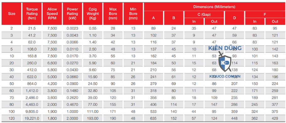 | Size | Moment xoắn (Nm) | Tốc độ trục cho phép (RPM) | Công suất định mức (Kg) | Chiều dài trục tối đa (mm) | Chiều dài trục tối thiểu (mm) | A | B | C (in/out) | D | F (in/out) |