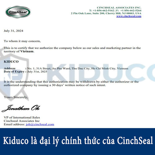 Công ty Kiên Dũng (KIDUCO), một nhà phân phối ngành vật liệu làm kín uy tín tại Việt Nam, đã nhận được sự tin tưởng của hãng CinchSeal, chính thức trở thành đại lý cung cấp gioăng phớt CinchSeal tại thị trường Việt Nam. Liên hệ qua Zalo (0988.461.465) để nhận báo giá các sản phẩm mới nhất.